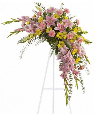 Looking for a sentimental and soothing way to pay tribute to a loved one's farewell service? Look no further than our Sweet Solace Spray. This breathtaking arrangement of yellow and pink blossoms will add light to any mournful event and serve as a reminder of the happy moments shared with the departed. Delicate pink lilies, poised gladioli, and caring carnations are paired with lively daisy mums and snapdragons, all encircled by variegated leaves and eucalyptus. The color pink signifies devotion, adoration, and love, while each flower holds its own unique meaning. Gladioli represent a noble spirit, lilies symbolize purity, snapdragons signify a strong connection, and carnations are a tribute of honor and respect. Our bouquet provides comfort and solace to everyone who sees it. Need quick delivery? No problem! Our local florist provides same-day delivery for orders placed before 1 p.m., and our nationwide network ensures that this heartfelt gift can be received in every corner of the United States. Call us today and discover the beauty of gifting flowers.